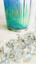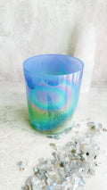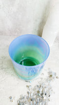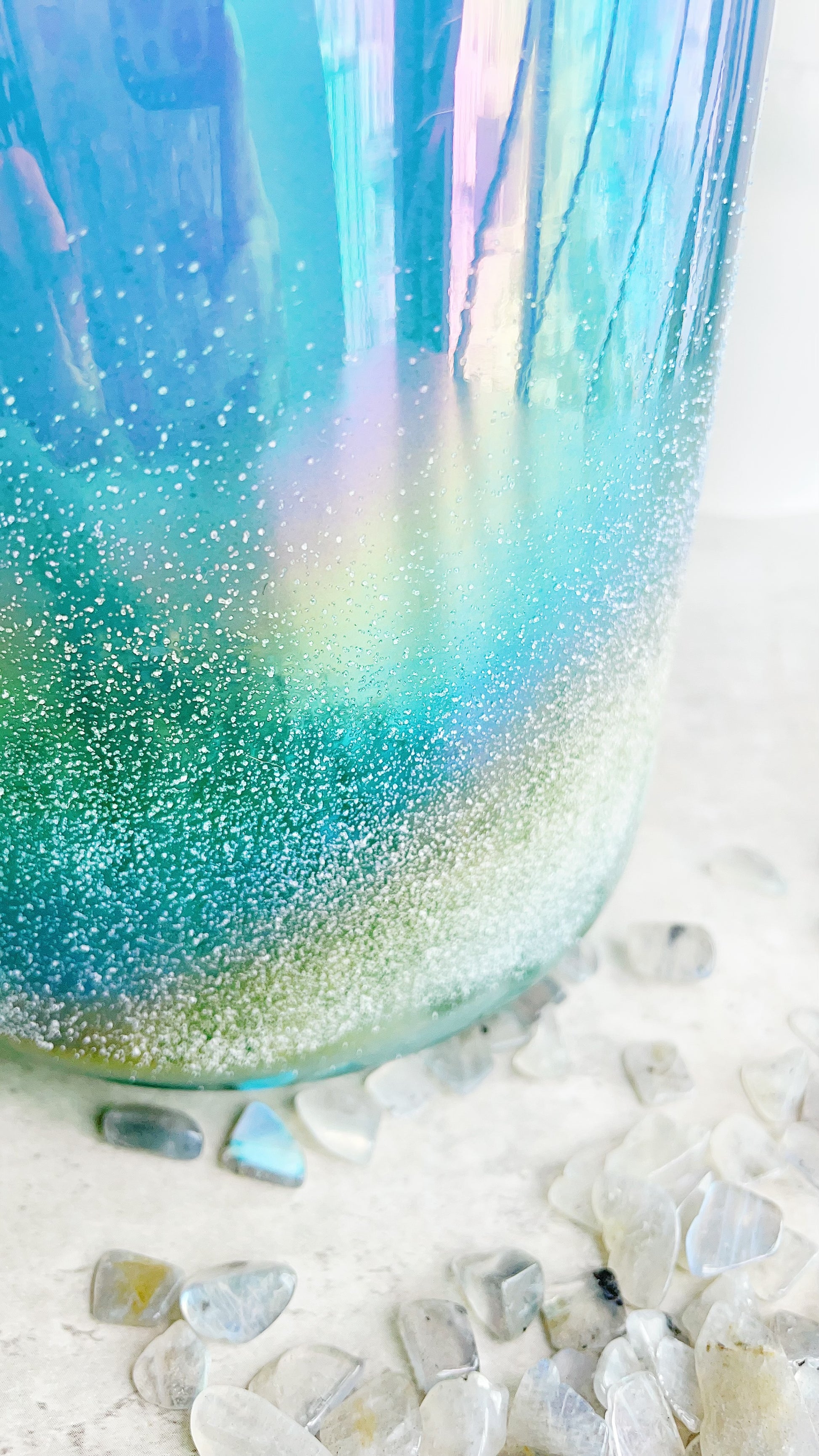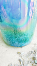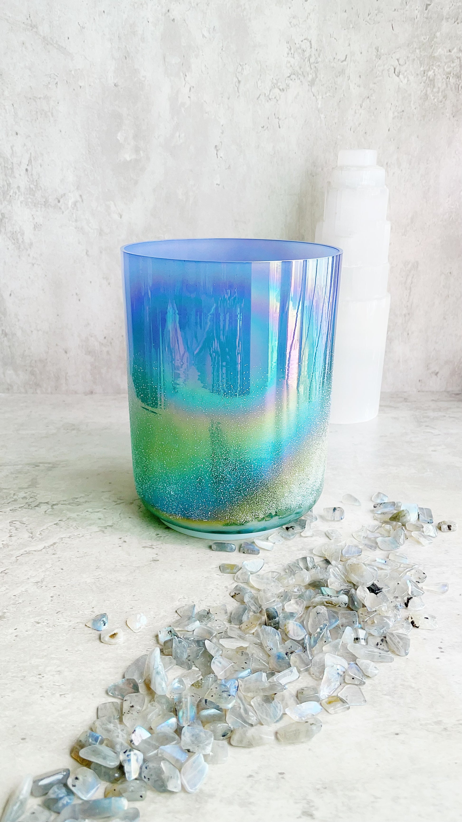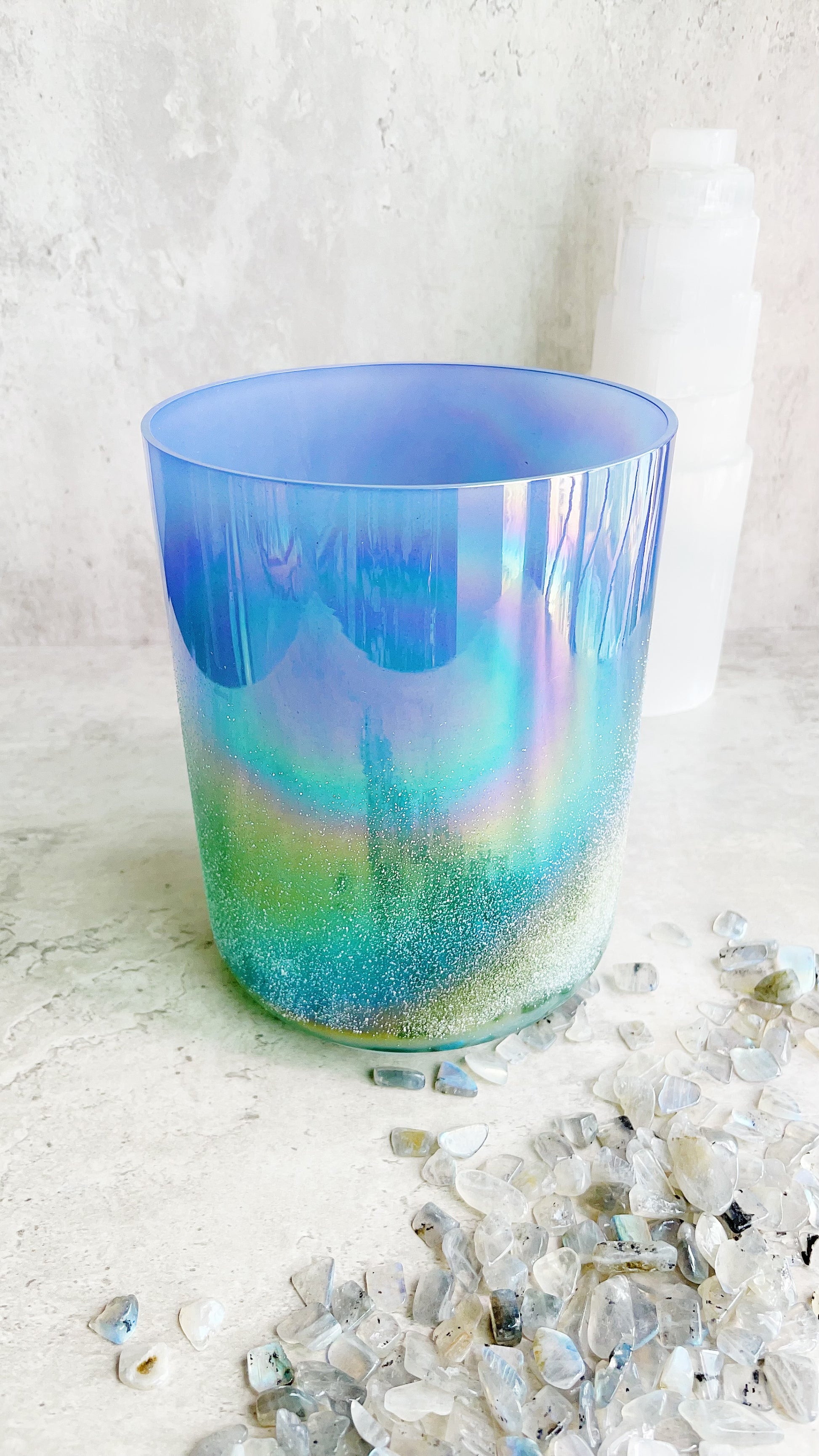This bowl embodies the ancient spirit of water- the consciousness that flows through sacred springs and moon-pulled tides. Its midnight purple-blue body, sprinkled with a magical stash of clear crystal stardust, holds the mystery of the cosmos, which aqua green swirls pulse with the rhythm of the sea, all crowned by an ethereal rainbow aura.