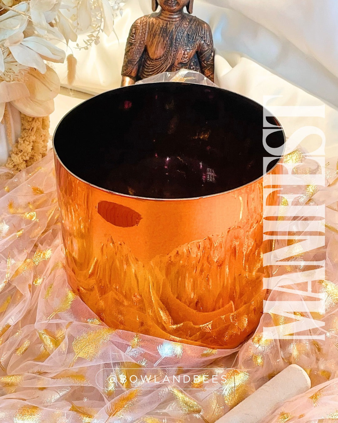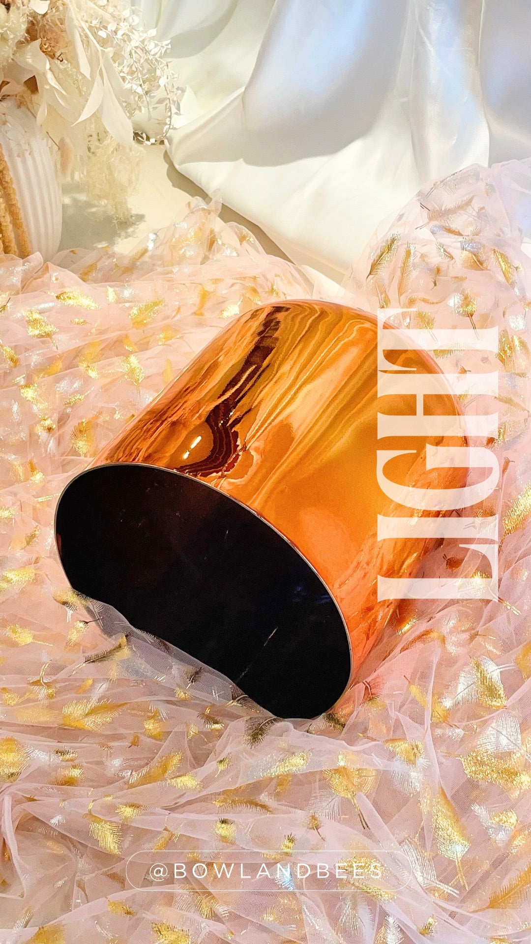 Shining in Rose Gold Copper, we have added two precious metals; rose gold and copper into our high grade clear crystals to create this magnificent crystal singing bowl. Copper is believed to be a conductor of energy in the spiritual realm, mirroring its conductivity with electricity in the physical world. It is said to combat lethargy and tiredness by moving energy through one’s spirit or aura, and can amplify optimism and positivity. Rose gold embodies the essence of beauty and love. The metaphysical element serves to expand the heart and invites one to lead life with love and compassion.