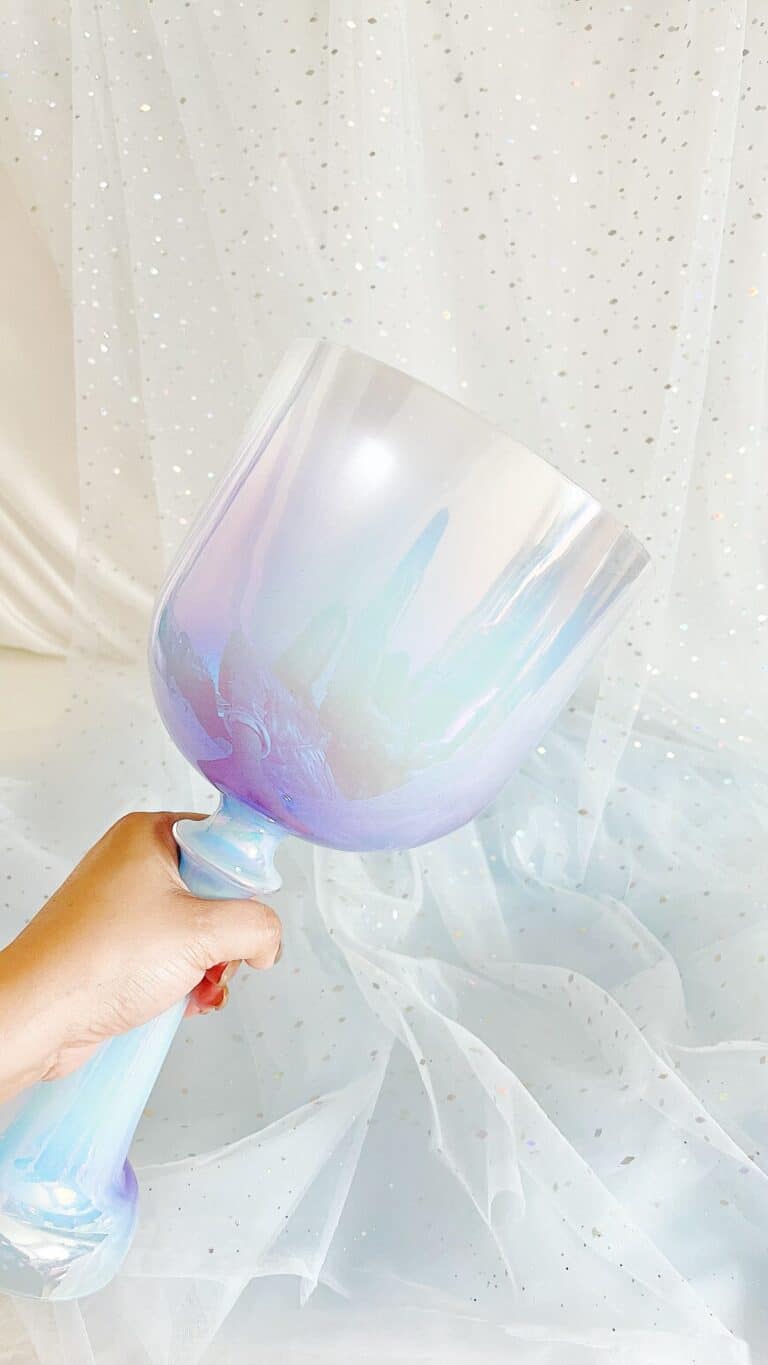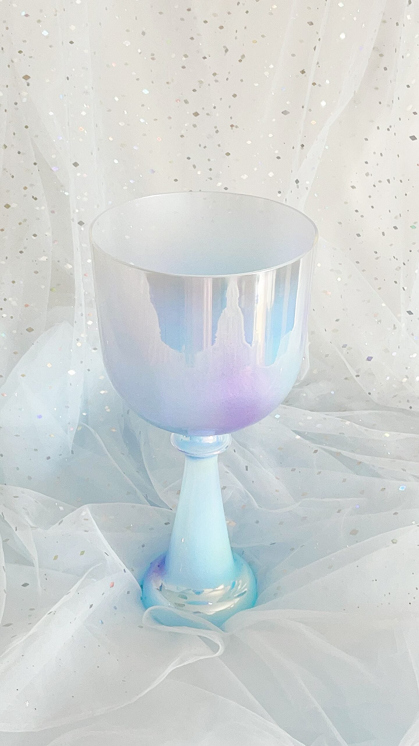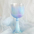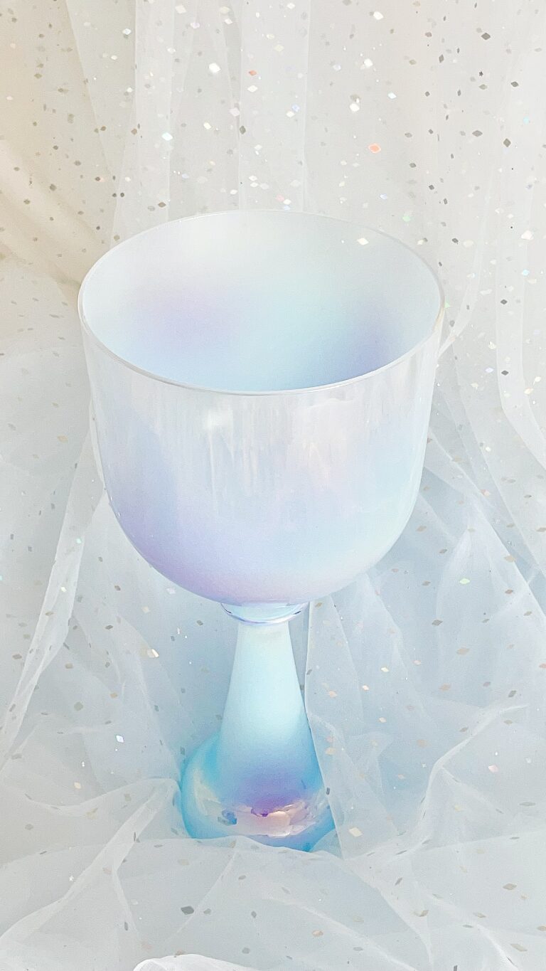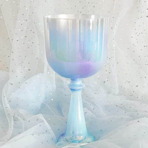 The Saint Blue, crystal singing chalice is carved from the very essence of a celestial dawn, its body a soft milky azure reminiscent of an angel's whispered sigh. This gentle blue holds the tender hue of a newborn soul - a baby blue serenity that seems to glow with an inner heavenly light, offering an immediate sense of divine peace.